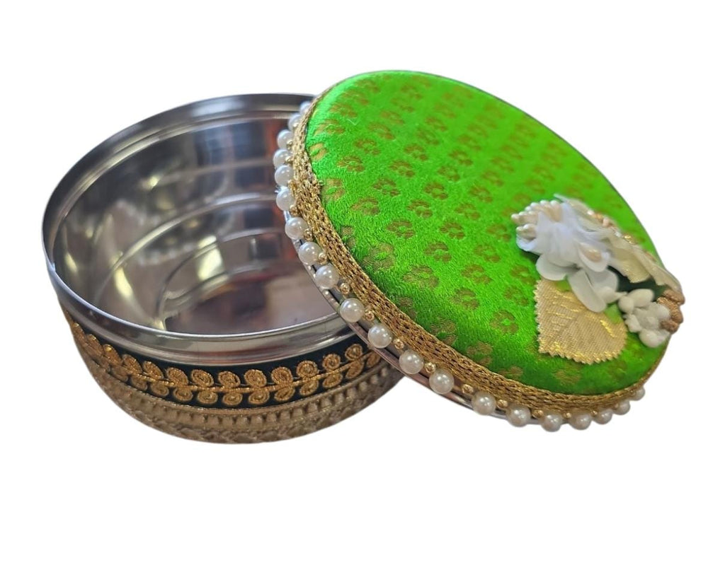 A trousseau box is a decorative box or container used to store items that are part of a bride's trousseau. A trousseau traditionally refers to the collection of personal items, clothing, jewelry, and household items that a bride gathers in preparation for her wedding and married life.